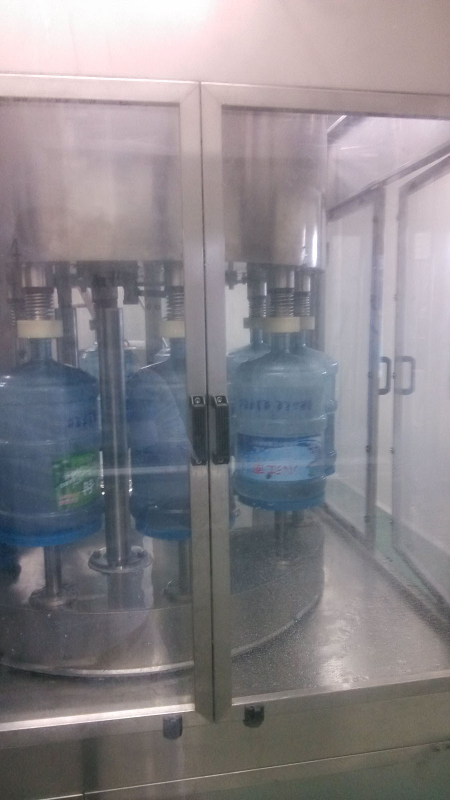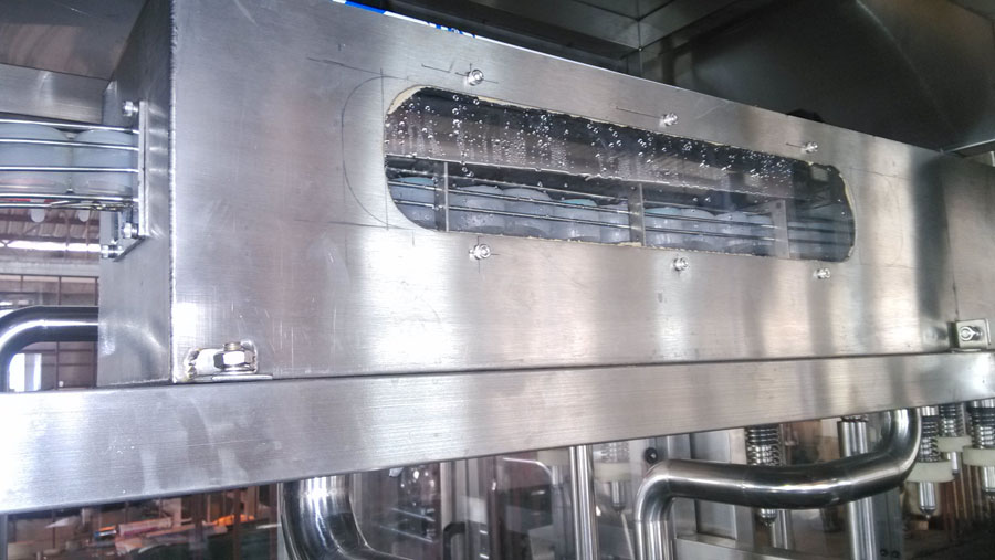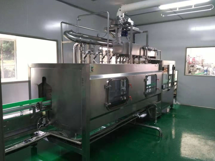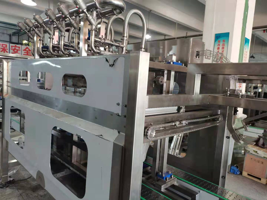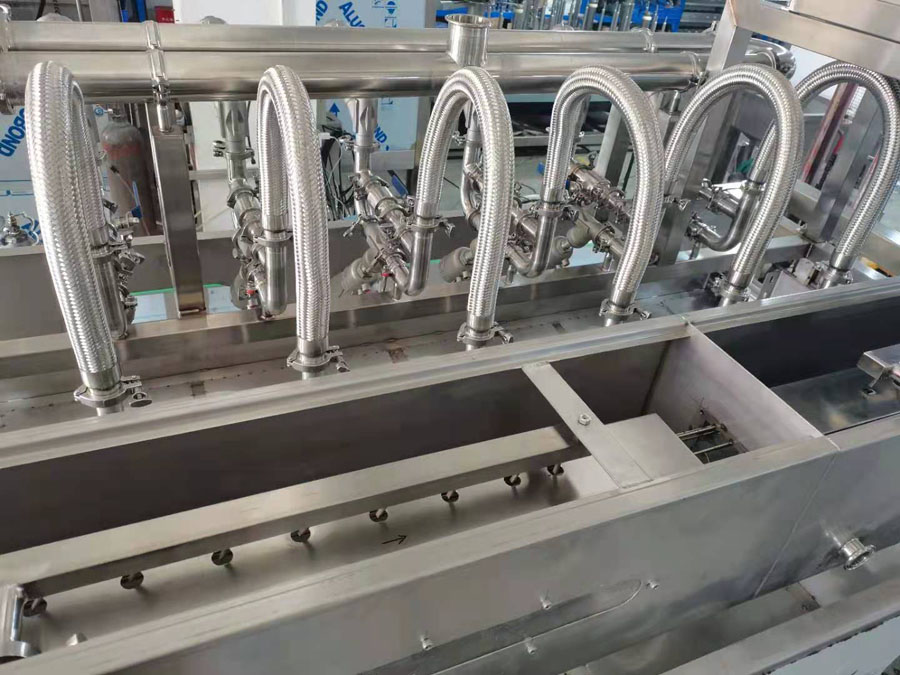 →进入纯水洗工位,经过可调时间纯净水冲洗,彻底清洗水瓶内部,此工位纯净水使用后进入回水箱再利用,减少净水损耗。