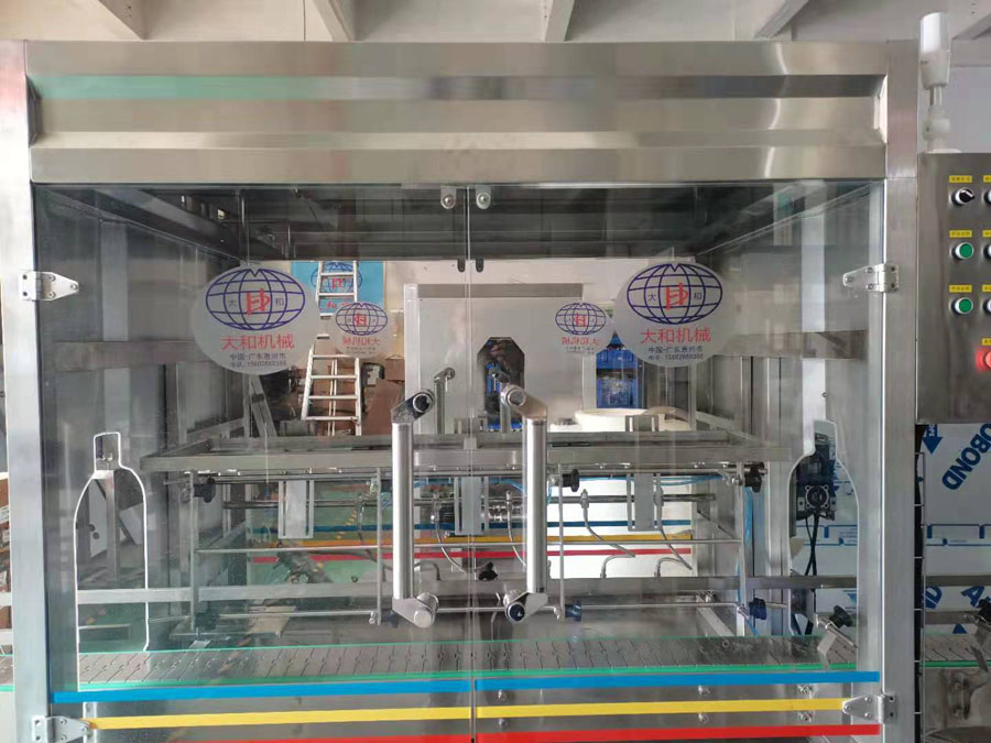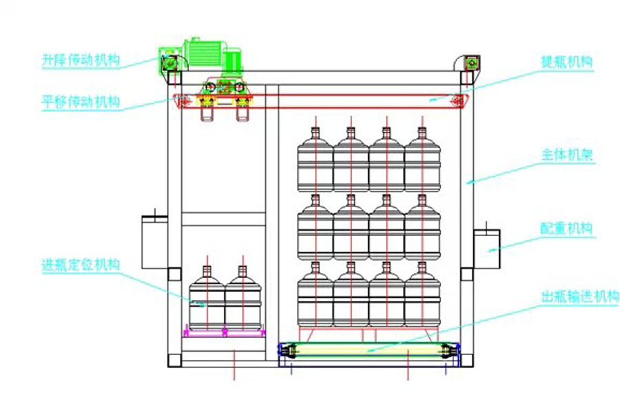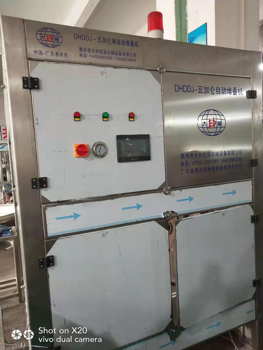 备,该设备占地面积少,运行费用低,每小时可将1200桶三加仑水瓶按要求叠成二层或三层(每层 4*4=16桶),以便于运输和存放,整台设备只需一人即可轻松操作,最大程度上减轻了员工