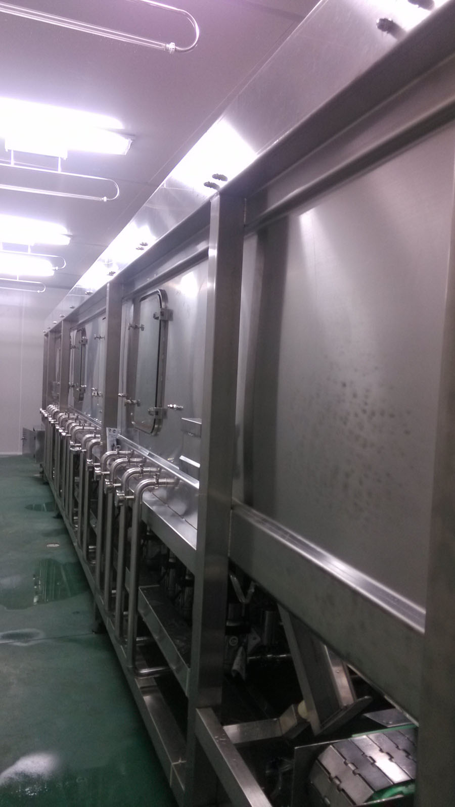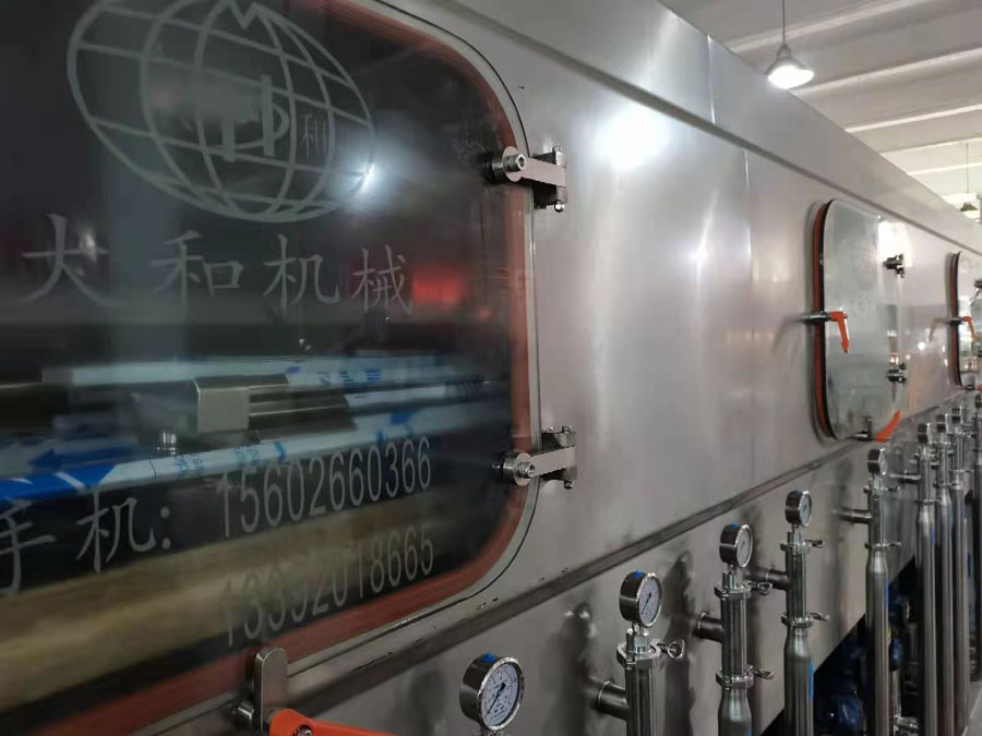 13.内洗机采用最新设计,按碱洗和消毒两大功能分成两段独立的内洗机,可以把独立的碱洗机放置在净化间外,以减少净化间面积,保证净化效果及降低能耗。
