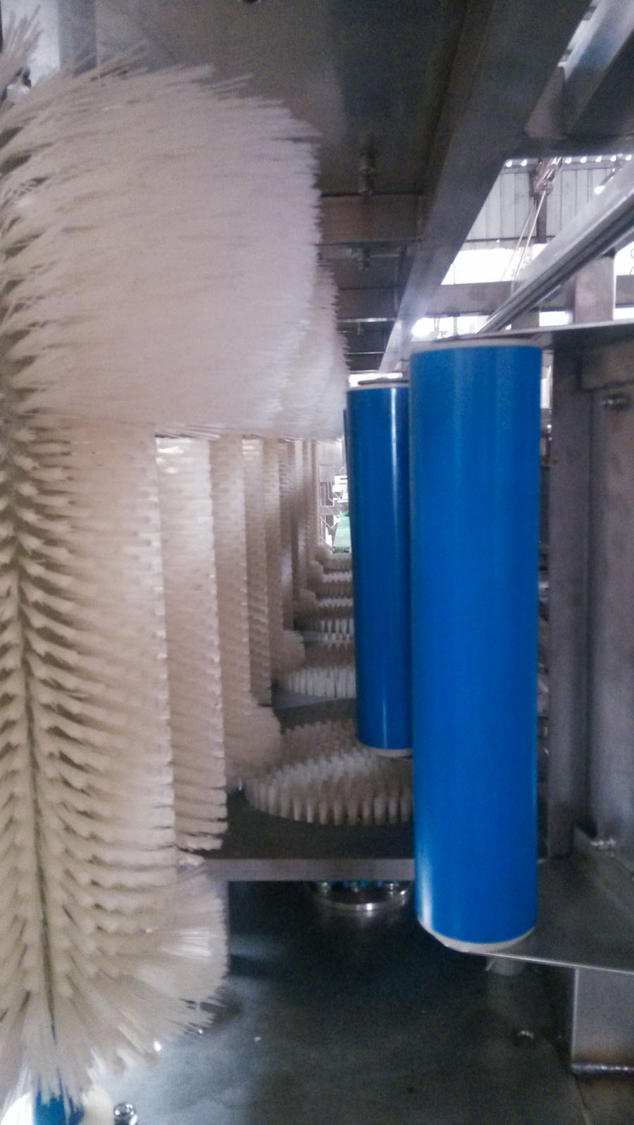f) 在桶的出口处,清水喷淋系统将刷洗洗涤剂冲洗干净;