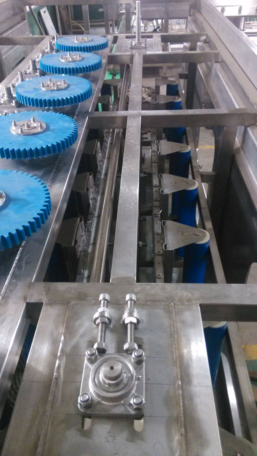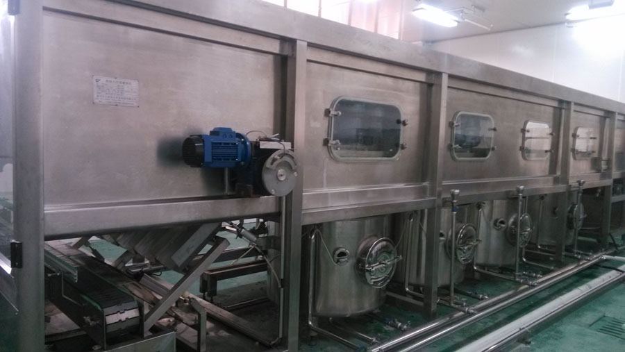 e) 所有毛刷、进瓶星轮均为齿轮传动,传动比设计精确,转速匹配合理,运转平稳,能全方位对桶表面进行扫刷,配合加热洗涤剂辅助喷淋,不存在任何清洗死角和盲区;